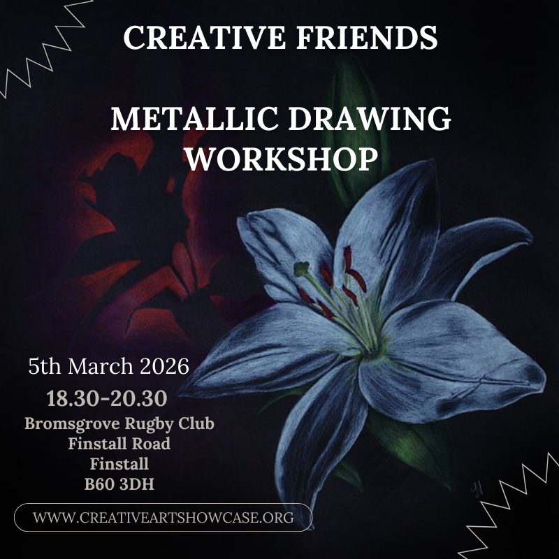 Next Workshop 5th March 2026 at Bromsgrove Rugby Clubhttps://www.ticketsource.co.uk/creative-art-showcase Let your imagination guide you to explore working with metallic pencils. Learn layering and blending shades to create unique textures and reflective effects.