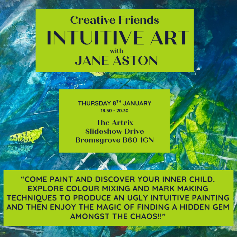 “Come paint with Jane Aston and discover your inner child. Explore colour mixing and mark making techniques to produce an ugly intuitive painting and then enjoy the magic of finding a hidden gem amongst the chaos!!”
